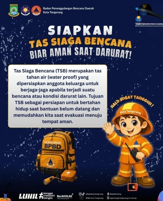 Kota Tangerang – Badan Penanggulangan Bencana Daerah (BPBD) Kota Tangerang mengimbau seluruh masyarakat untuk menyiapkan Tas Siaga Bencana (TSB) sebagai langkah antisipasi menghadapi situasi darurat. Imbauan tersebut disampaikan melalui kanal media sosial resmi BPBD Kota Tangerang, sebagai bagian dari edukasi kesiapsiagaan bencana kepada masyarakat.