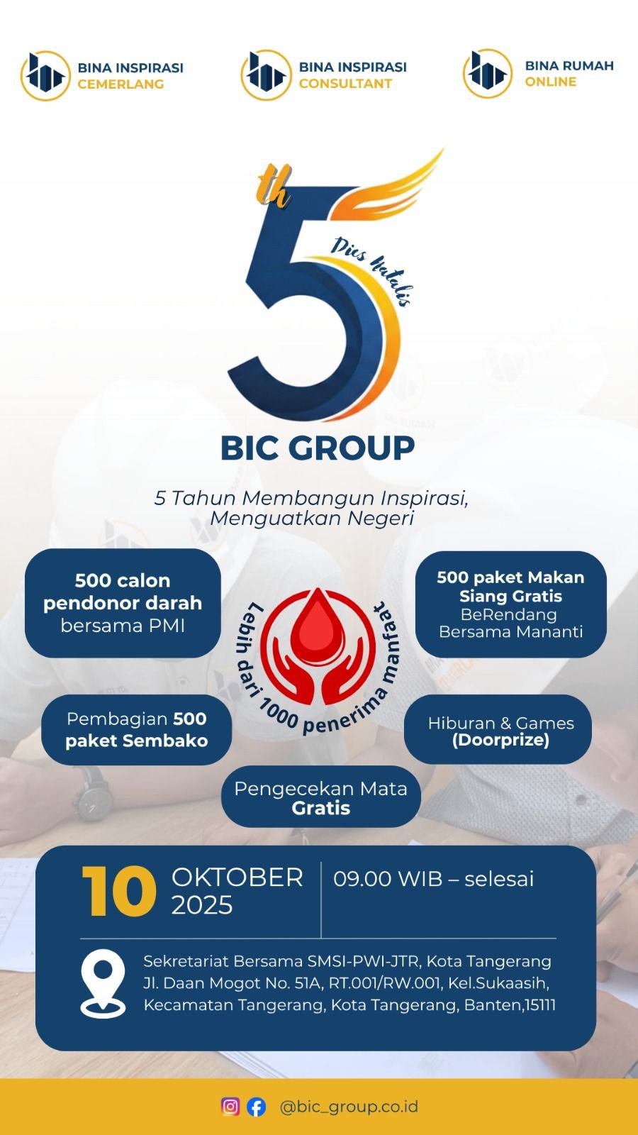 tak hanya menjadi ajang syukuran ulang tahun perusahaan, tetapi juga bentuk nyata kepedulian BIC Group terhadap masyarakat sekitar. Melalui semangat Serba 5, BIC Group ingin menegaskan bahwa keberhasilan perusahaan harus diimbangi dengan kontribusi sosial yang berkelanjutan.