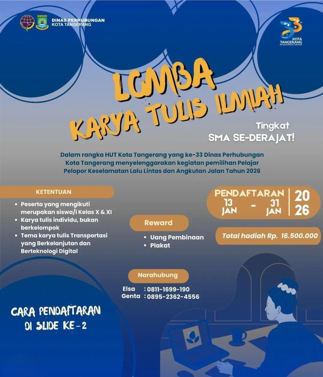 Kota Tangerang – Dalam rangka memperingati Hari Ulang Tahun (HUT) ke-33 Kota Tangerang, Dinas Perhubungan (Dishub) Kota Tangerang mengajak pelajar tingkat SMA sederajat untuk berperan aktif dalam pembangunan sektor transportasi melalui Lomba Karya Tulis Ilmiah Pelajar Pelopor Keselamatan Lalu Lintas dan Angkutan Jalan Tahun 2026.