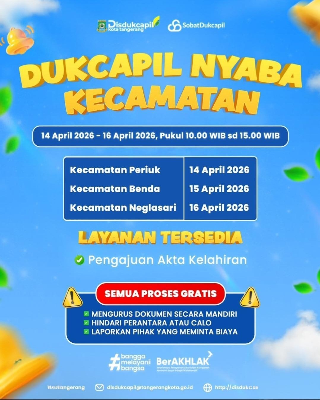 KOTA TANGERANG – Pemerintah Kota Tangerang melalui Dinas Kependudukan dan Pencatatan Sipil (Disdukcapil) kembali menghadirkan inovasi pelayanan publik melalui program Dukcapil Nyaba Kecamatan. Program ini digelar pada 14–16 April 2026 di tiga wilayah kecamatan, yakni Periuk, Benda, dan Neglasari.