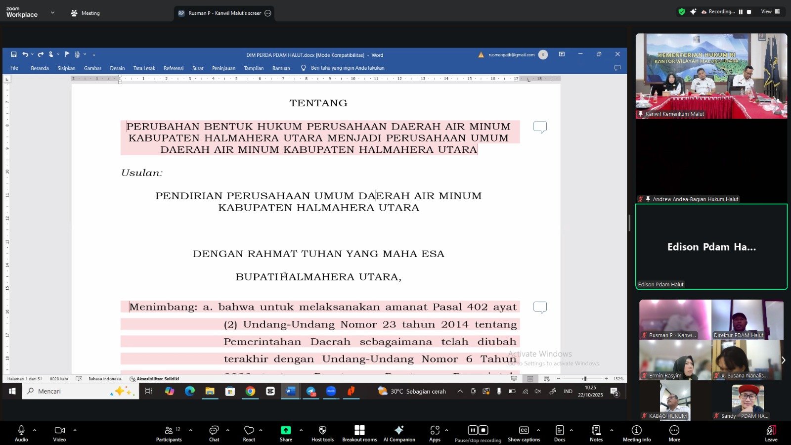 Ternate – Kantor Wilayah (Kanwil) Kementerian Hukum (Kemenkum) Maluku Utara (Malut) menyelenggarakan harmonisasi Rancangan Peraturan Daerah (Ranperda) tentang Perubahan Bentuk Hukum Perusahaan Daerah Air Minum (PDAM) Kabupaten Halmahera Utara (Halut) menjadi Perusahaan Umum Daerah (Perumda) Air Minum Kabupaten Halut.