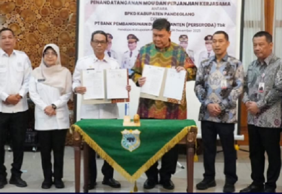 Pandeglang – Pemerintah Kabupaten Pandeglang resmi tandatangani kerja sama dengan Bank Pembangunan Daerah Banten (Bank Banten) melalui penandatanganan Memorandum of Understanding (MoU) terkait pengelolaan Rekening Kas Umum Daerah (RKUD). Penandatanganan berlangsung di Pendopo Kabupaten Pandeglang, Rabu (24/12).