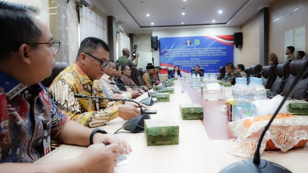 Ternate – Kepala Kantor Wilayah (Kakanwil) Kementerian Hukum (Kemenkum) Maluku Utara (Malut), Budi Argap Situngkir menandatangani Nota Kesepahaman atau Memorandum of Understanding (MoU) dengan Bupati dan Walikota se Provinsi Malut di ruang rapat Wakil Gubernur Malut, Ternate, Sabtu (23/8).
