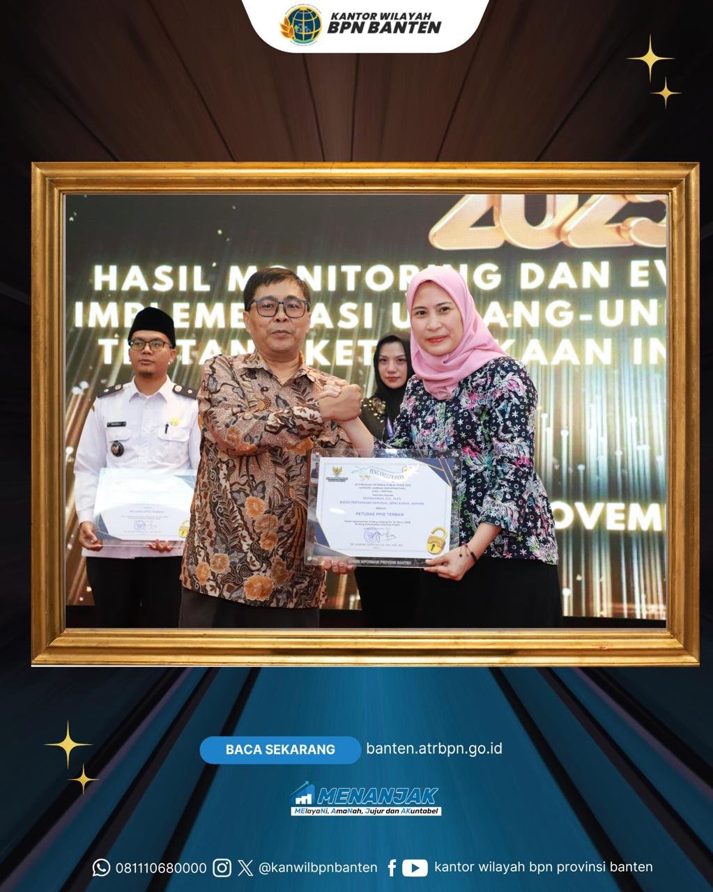 Serang — Kantor Wilayah Badan Pertanahan Nasional (BPN) Provinsi Banten meraih predikat Badan Publik Informatif pada ajang Penganugerahan Keterbukaan Informasi Publik Tahun 2025 yang diselenggarakan oleh Komisi Informasi Provinsi Banten.