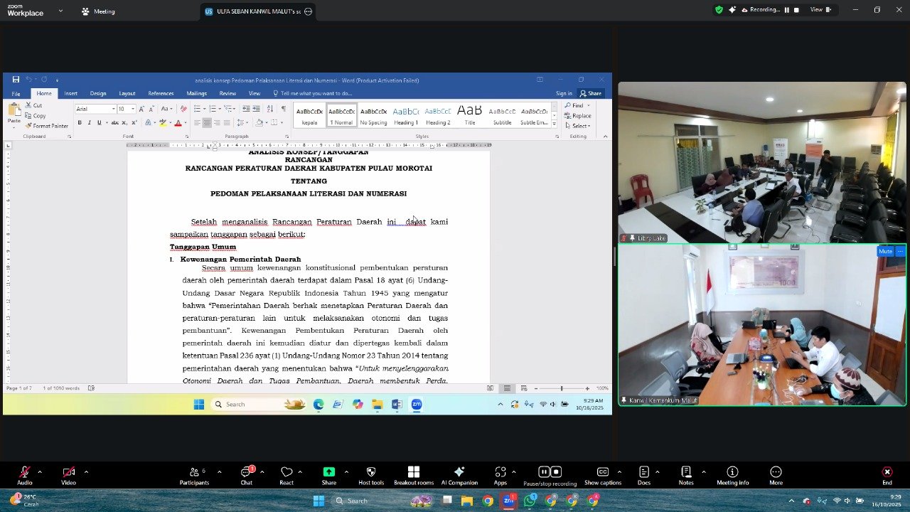 Ternate – Kantor Wilayah Kementerian Hukum Maluku Utara melalui Divisi Peraturan Perundang-undangan dan Pembinaan Hukum (P3H) menyelenggarakan Rapat Harmonisasi terhadap dua Rancangan Peraturan Kepala Daerah (Ranperkada) Kabupaten Pulau Morotai (16/10). Kegiatan yang digelar secara hybrid di Ruang Rapat Kanwil Kemenkum Malut dan melalui Zoom Meeting ini membahas Rancangan Peraturan Kepala Daerah tentang Pelaksanaan Literasi dan Numerasi serta Rancangan Perubahan atas Peraturan Bupati Pulau Morotai Nomor 2 Tahun 2023 tentang Pelaksanaan Hak Keuangan dan Administratif Pimpinan dan Anggota DPRD Kabupaten Pulau Morotai.