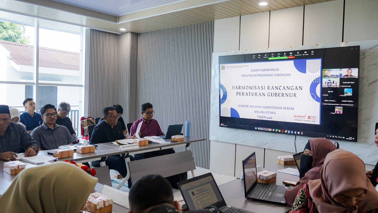 Ternate – Kantor Wilayah Kementerian Hukum (Kemenkum) Maluku Utara (Malut) melalui Divisi Peraturan Perundang-undangan dan Pembinaan Hukum melaksanakan rapat harmonisasi terhadap empat Rancangan Peraturan Gubernur (Ranpergub) Maluku Utara pada Kamis (16/4) di Ruang Legal Drafting Kanwil Kemenkum Malut. Kegiatan ini menjadi bagian dari upaya memastikan setiap produk hukum daerah yang disusun memiliki kualitas yang baik, tidak bertentangan dengan peraturan yang lebih tinggi, serta selaras dengan kebijakan pembangunan nasional.
