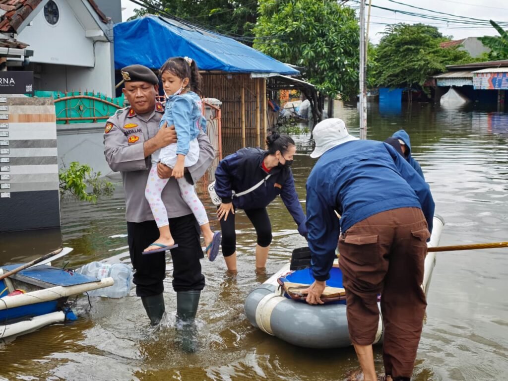 Di Tengah Genangan, Polisi Hadir Menguatkan Warga: Polres Metro Tangerang Kota Terjun Langsung Evakuasi Korban Banjir di Periuk