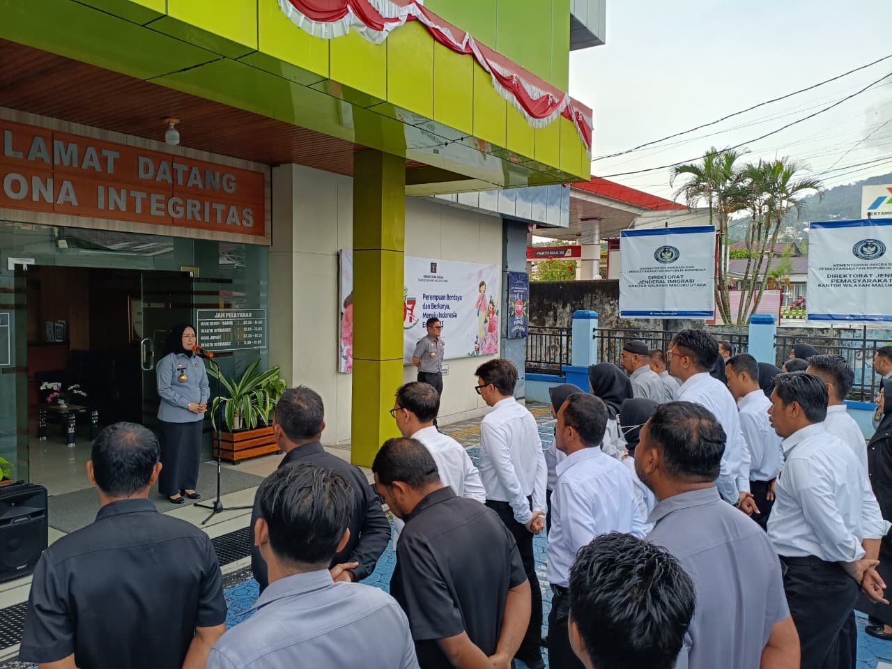 “Pelayanan kepada masyarakat harus terus kita tingkatkan. Berikan yang terbaik, karena kepuasan masyarakat adalah cerminan kinerja kita sebagai aparatur Kementerian Hukum,” tegas Mia saat menjadi pembina apel pagi di halaman Kemenkum Malut, Selasa (20/1).