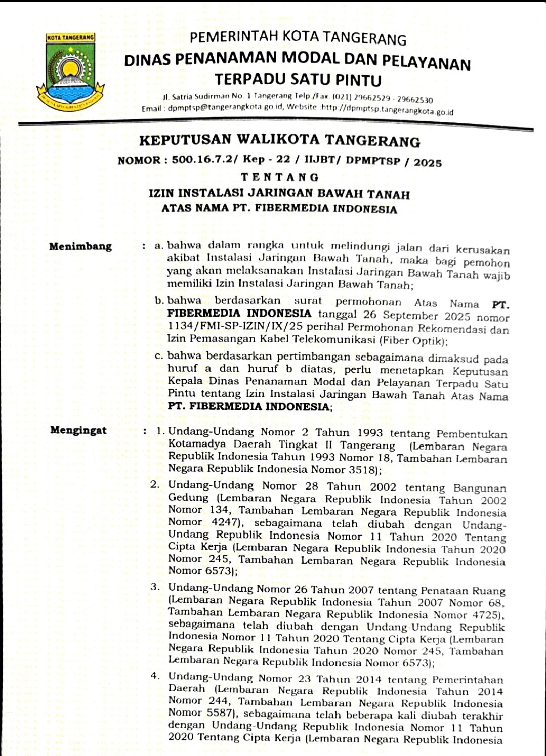 Hal ini merujuk pada Keputusan Walikota Tangerang Nomor 500.16.7.2/Kep-22/IIJBT/DPMPTSP/2025 tentang Izin Instalasi Jaringan Bawah Tanah yang ditetapkan pada 14 Oktober 2025.
