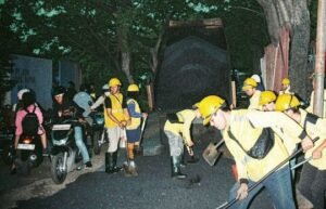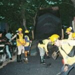 Tegal- Usai mengerjakan aspal jalan, anggota Kodim Tegal istirahat sejenak. Sekedar melepas lelah, sembari makan tahu pemberian warga simpatisan sekitar.
