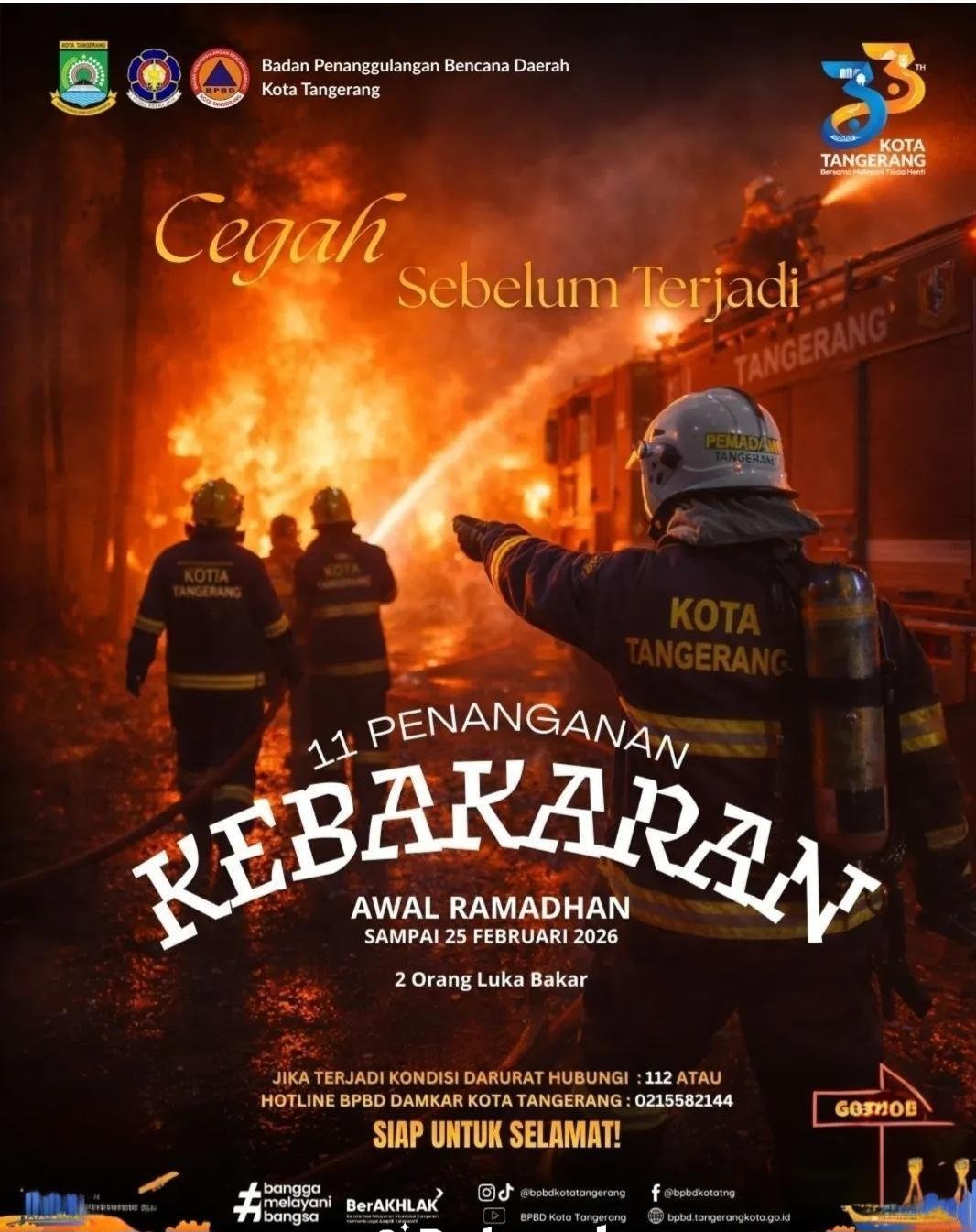 Kota Tangerang – Badan Penanggulangan Bencana Daerah (BPBD) Kota Tangerang mencatat, sejak awal Ramadhan hingga 25 Februari 2026 telah terjadi 9 peristiwa kebakaran dan 2 kejadian percikan api pada tiang/kabel listrik di sejumlah wilayah Kota Tangerang.