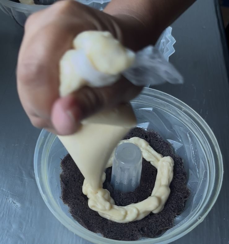 Kue ini dibuat dari ketan hitam berkualitas tinggi dengan isian keju leleh di bagian tengah bolu. Proses pembuatannya dilakukan dengan cermat dan terampil — adonan dikukus setengah matang terlebih dahulu, lalu diberi lapisan keju di tengah, sebelum ditutup kembali dengan sisa adonan dan dikukus hingga matang sempurna. Teknik ini menghasilkan tekstur yang lembut dengan rasa manis dan gurih yang berpadu seimbang.